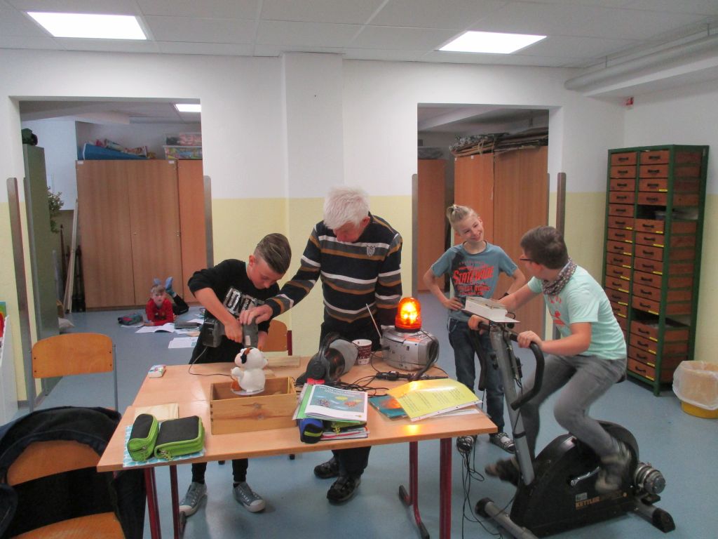 Es wurden verschiedene Geräte mit Solartechnik erforscht und auch eine Theoriestation mussten die Schüler bestehen. Auf dem Energiefahrrad betrieben die Kinder eigens eine Bohrmaschine, mit der sie die ein Loch in Holz-Unterlage für den folgenden Praxisteil bohrten.
