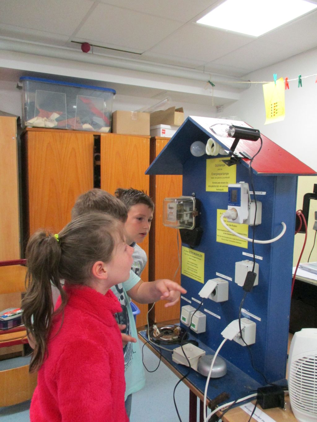 Die dritten Klassen durchliefen verschiedene Stationen rund um das Thema Strom und Energieerzeugung. Am Stromhaus testeten die Kinder den Verbrauch verschiedener Geräte, der „Gewinner“ war der Heizlüfter auf höchster Stufe mit fast 2000 Watt.