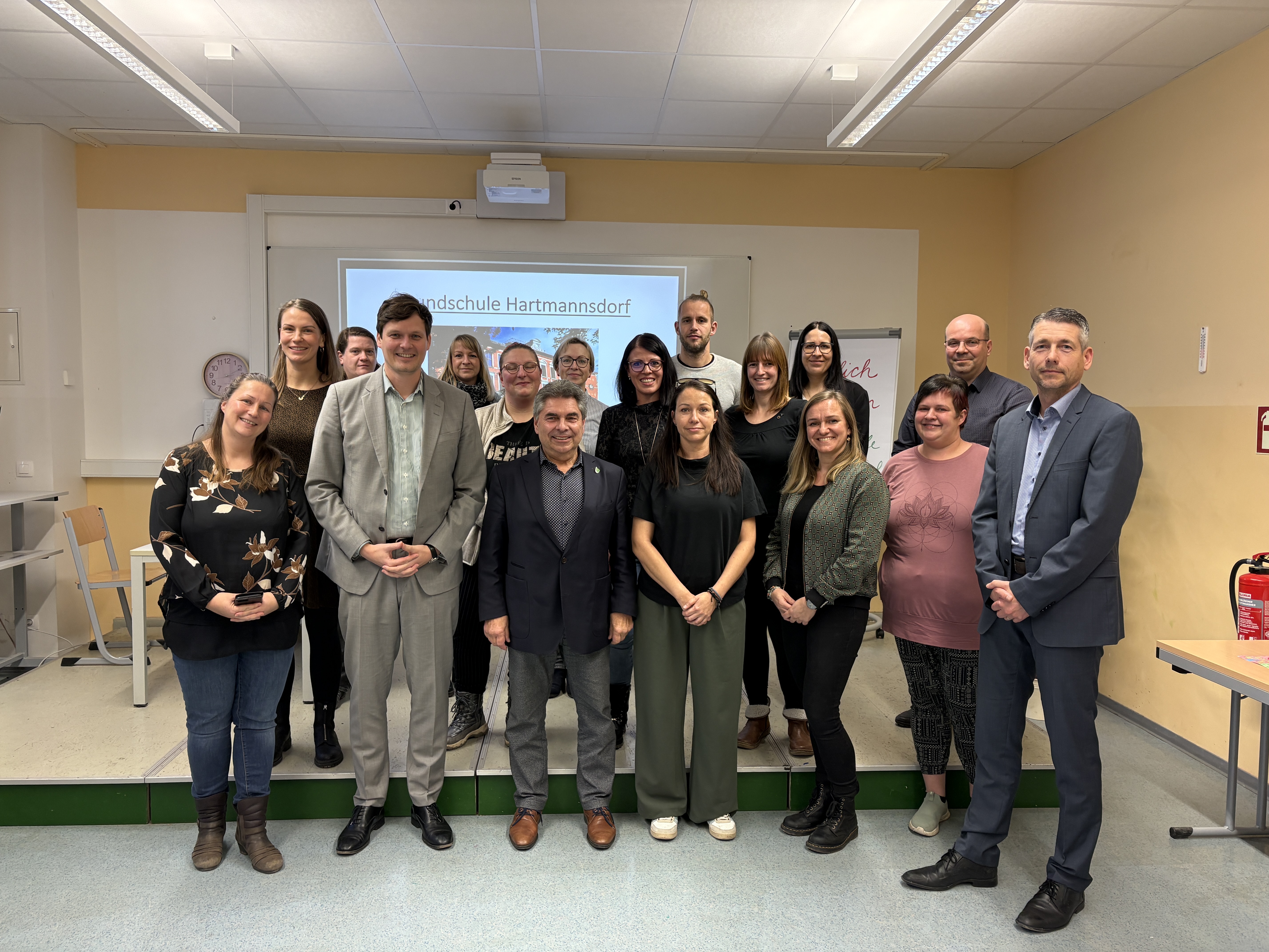 Kultusminister Clemens hat am 11.12.2025 die Grundschule Hartmannsdorf besucht. Anlass des Termins war eine Einladung der Elternschaft, die das Gespräch mit dem Ministerium suchte, um auf bestehende Herausforderungen aufmerksam zu machen.