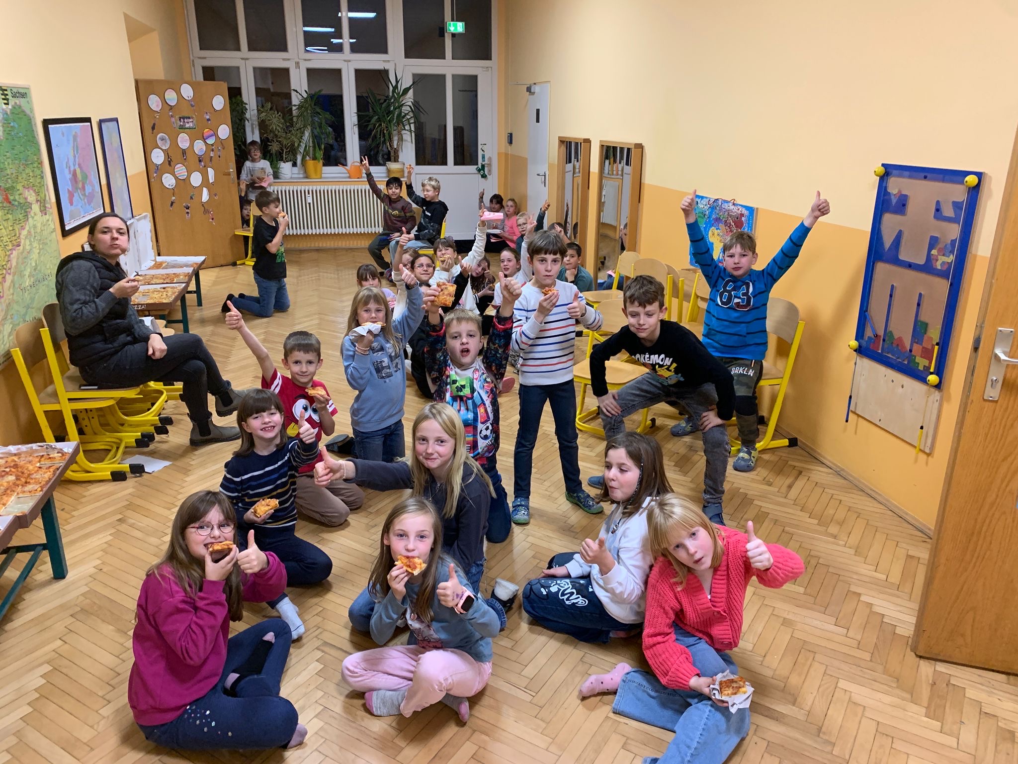 In der Grundschule Hartmannsdorf fand eine aufregende Lesenacht für die Klassen 3 und 4 statt. Schon am späten Nachmittag begann die Vorfreude, denn in den Klassenzimmern wurden Höhlen und kleine Lager gebaut, in denen sich die Kinder später gemütlich einkuscheln konnten. Zur Stärkung gab es zunächst Pizza, die allen schmeckte und für eine fröhliche Stimmung sorgte.