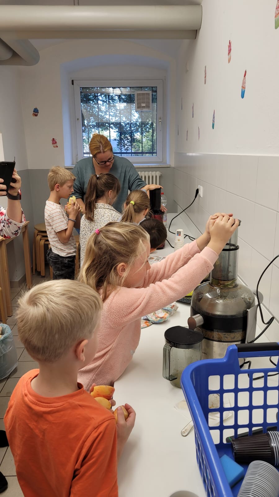 Besonders genossen wurde auch der selbst gebackene Apfelkuchen, der als köstliche Stärkung vor dem Ausflug zu den Apfelbäumen gegessen wurde. So konnten die Kinder das im Unterricht Gelernte direkt mit praktischen und genussvollen Erfahrungen verbinden.